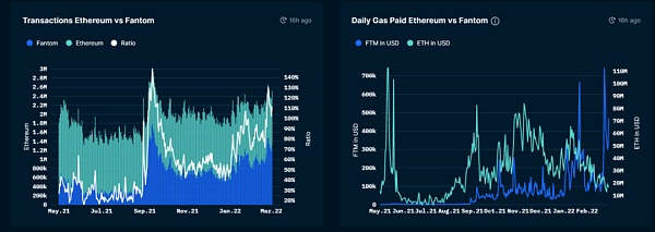與ETH進行對比我們更可以發現Fantom成長之明顯,交易量方面的差距逐漸縮小,交易手續費甚至超過了ETH,這一方面是由于近期ETH鏈上生態冷淡,但也反映出Fantom的火熱。