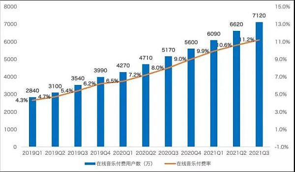 其中美國、日本、英國、德國、法國位列音樂消費大國前5,中國位列第7,僅次于韓國。雖然中國擁有全球最高的互聯網人口,但在音樂上其付費用戶占比遠低于西方。根據中國用戶量、營收TOP1的騰訊音樂娛樂集團(TME)披露的2021年3季度財報,其在線音樂付費用戶達到7120萬,付費用戶占比為11.2%,用戶2021年前三季度的用戶Arpu值(每月每用戶付費情況)為8.9元(rmb)。
