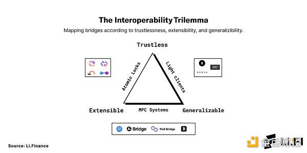 驗證者的角色是「橋」工作方式的主要區別所在。從本質上講,一些「橋」使用可信系統 (trusted system),而另一些橋使用無須信任的驗證者系統 (trustless system)。此外,由于加密生態系統中的「互操作性三難困境」,我們看到了不同類型的區塊鏈「橋」設計。互操作性三難困境指出「互操作性協議或「橋」只能具有以下三個屬性中的兩個: