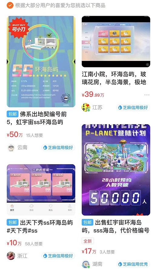 國外元宇宙平臺天價虛擬房產、虛擬土地交易頻出,國內的一些元宇宙平臺上的虛擬房產、虛擬土地項目也悄然受到追捧。2021年10月,上市公司天下秀開發的元宇宙APP“虹宇宙” 開始內測,用戶預約后可以搶購虛擬房產。隨后,我們就看到國內的一些第三方交易平臺上出現了元宇宙虛擬房產的轉讓叫賣,一些所謂的頂級房產項目在閑魚上的轉讓價一度高達50萬元。
