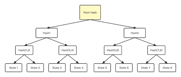 對于每兩個狀態信息(例如State 1/State 2),我們可以根據某種哈希公式計算出一個唯一的哈希值(eg: Hash(1,2) )來作為這兩個葉子節點的父親節點,依次一層一層往上類推,最終得到一個哈希值存儲在根節點中: