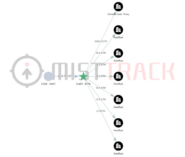 接著,我們對 Ethereum 上的資金與行為進行深入分析:據慢霧 MistTrack 反洗錢追蹤系統的分析,黑客將 2450 ETH 以?5x10 ETH+24x100 ETH 的形式分批轉入 Tornado.Cash,將 198 ETH 轉入 FixedFloat,這讓我們繼續追蹤 Tornado.Cash 部分留了個心眼。