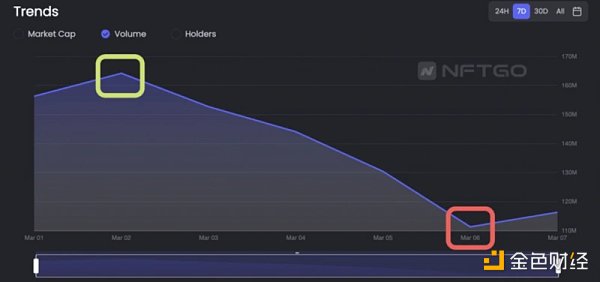 根據NFTGo數據,過去30天中,NFT市場交易量呈波動下滑趨勢。在下跌期間階段性小幅度回調多見于新聞向的利好消息,比如Yuga Labs的收購事件等。