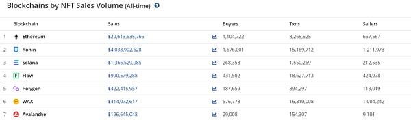 NFT行業的公鏈競爭呈現群雄并起的態勢,有7條公鏈的NFT交易量突破1億美元,分別是以太坊、Ronin、Solana、Flow、Polygon、WAX和Avalanche。其中Ronin、Flow和WAX是為NFT打造的公鏈。