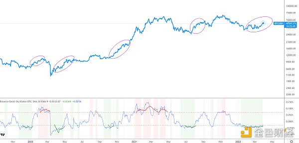 如圖所示,上方為BTC價格走勢,下方為BTC震蕩指數,研究可以發現,前期BTC震蕩指數如果處于圖中低位水平綠線一段時間,后面BTC往往都會迎來一波上升波段行情,而一旦該指數升至高位紅線區域,往往代表BTC已經處于階段頂部,后面一般都會出現一波回調趨勢行情。