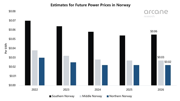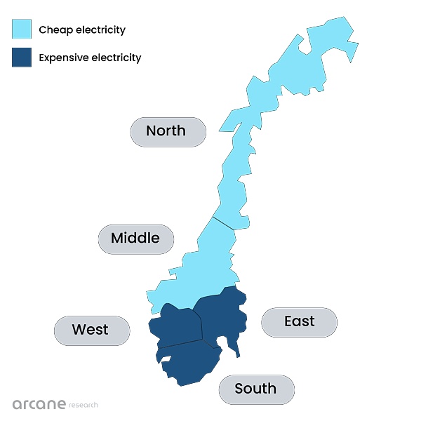從2021年開始,挪威南部和北部地區出現了巨大的電價差異。這種價格差距將持續存在,因此,礦商應該理想地將業務設在成本低得多的北方。