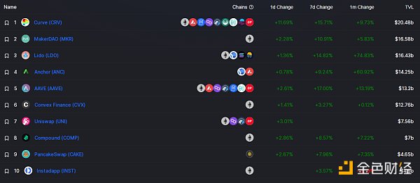 DeFi項目鎖定資產前十排名及鎖倉量 數據來源:defillama