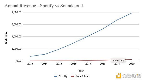 區塊鏈抽象出了驗證層,并使所產生的成本被極致壓縮。那信任本身會產生溢價嗎?我認為是的。讓我們考慮幾個平臺擁有商業權利的例子,并與不擁有商業權利的平臺進行比較。音樂將是一個很好的主題,所以我們用Spotify和Soundcloud作為例子。