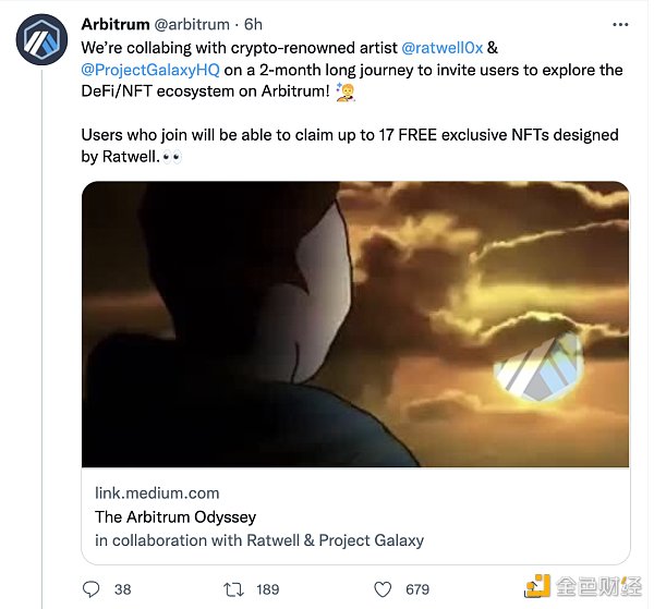 XRP/HKD-6.97%4 月 12 日,以太坊擴展方案 Arbitrum 宣布獎舉辦 Arbitrum 生態體驗獎勵計劃,獎品為 Project Galaxy 和加密藝術家 Ratwell 、Sugoi設計和發行的 NFT。