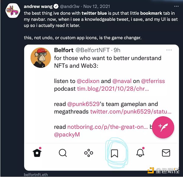 幾乎每一個流行的加密貨幣話題都會有一個好的主題。你不可能實時閱讀它們。在每個星期結束時回顧你所有的書簽。如果你所在的地方有Twitter Blue,就注冊它,并將這些推文整理到書簽文件夾中。每個月3美元的費用對這個功能來說是非常值得的。