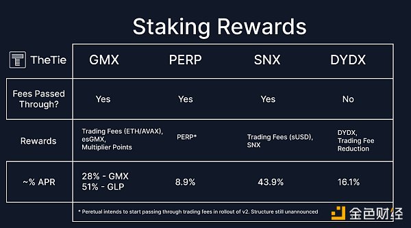 與GMX和SNX不同,dYdX和PERP目前不將產生的任何交易費用收入傳遞給代幣持有者。PERP已宣布計劃通過推出他們的v2計劃開始傳遞;dYdX似乎沒有這樣的意圖。分享交易費用使用戶可以從他們喜歡的平臺中獲得收益。如果交易量增加,那么收益也將相應增加。
