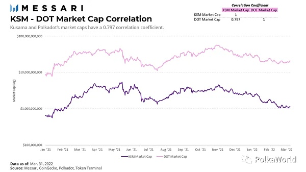 Polkadot 生態系統的另一個獨特組成部分是金絲雀網絡 Kusama。Kusama 是一個主權區塊鏈,其代碼庫和架構與 Polkadot 幾乎相同;但是,與 Polkadot 的 28 天投票相比,Kusama 具有更快的治理機制,投票只需要 7 天。在遷移到 Polkadot 之前,所有新的代碼發布都在 Kusama 上提出、批準、測試和實施。因此,Polkadot 和 Kusama 密切相關。在過去五個季度中,兩個網絡的市值以 0.797 的相關系數密切跟蹤對方。