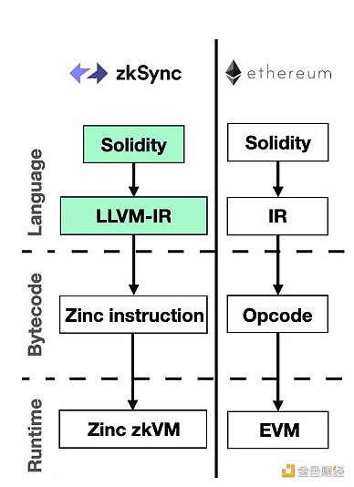 另一個采用這種策略的團隊是 zkSync。zkSync 創建了自己的 VM (SyncVM),它基于寄存器并定義了自己的代數中間表示 (AIR)。然后他們構建了一個專門的編譯器來將 Yul(一種中間語言,可以編譯為不同 EVM 版本的字節碼,認為是較低級別的 Solidity)編譯成 LLVM-IR,然后他們將其編譯成自定義 VM 的指令。這類似于 StarkWare 采用的方法,但理論上提供了圍繞基礎語言的更大靈活性(盡管目前僅支持 Solidity 0.8.x)。zkSync 團隊最初創建了他們自己的類 CAIRO 語言 (Zinc),但他們將大部分精力集中在 Solidity 編譯器上,以便為 L1 開發人員提供更簡單的遷移。一般來說,他們的策略是重用以太坊工具集而不是 StarkNet——我希望他們的客戶端 API 等也更加“與以太坊兼容”。