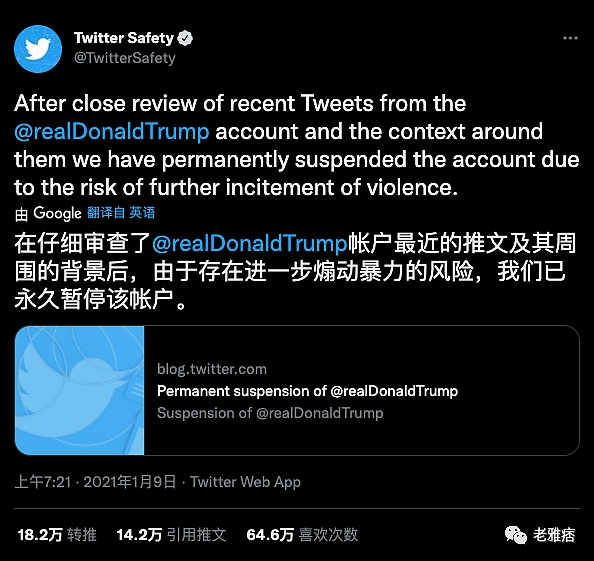 在他的評論中,馬斯克沒有直接談到特朗普在國會大廈襲擊事件中的作用,而是重點談到了這一決定的影響,以及他認為只有機器人和垃圾水軍賬戶才應該面臨永久性的Twitter禁令。他還聲稱,永久禁令 "從根本上破壞了對推特作為一個人人可以發表意見的城市廣場的信任"。