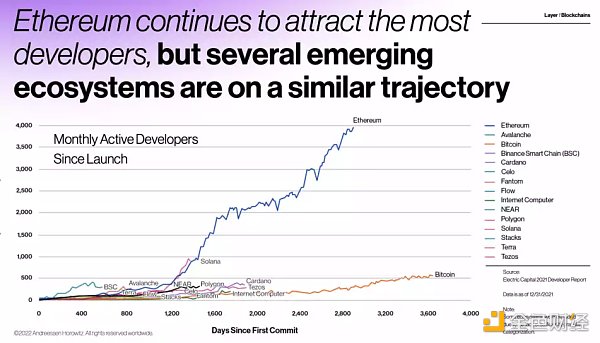 以太坊的領先與它的早期起步和社區的健康有很大關系。就開發者興趣而言,以太坊擁有最多的構建者,每月有近 4000 名活躍開發者。18(見幻燈片)。緊隨其后的是 Solana(接近 1000) 和比特幣 (約 500)。以太坊壓倒性的影響力有助于解釋為什么它的用戶平均每天愿意支付超過 1500 萬美元的費用來使用區塊鏈——對于這樣一個年輕的項目來說,這是很了不起的。
