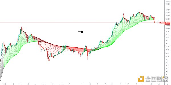 同時BTC周線也下滑到了關鍵頸線一帶,一旦有效跌破,后面調整力度或將加大,支撐線28600一帶,2018年熊市BTC跌破頸線出現大幅下殺,2014年熊市跌破反復回抽消磨后繼續下殺,注意風險。