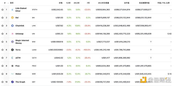 DeFi項目鎖定資產前十排名及鎖倉量 數據來源:defillama