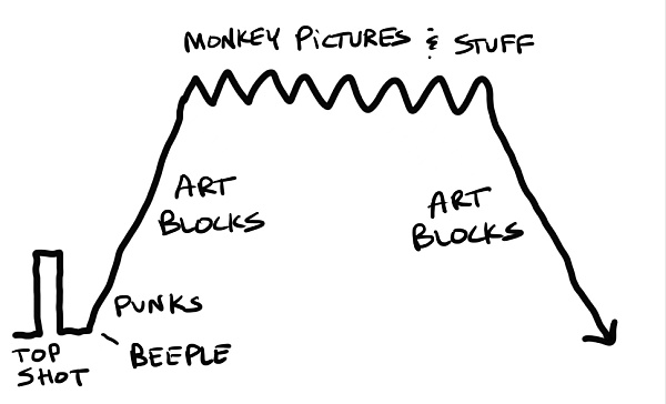 這一波的NFT泡沫由NBA TopShots球星卡燃起火種,然后遠古的CryptoPunks涅槃,Beeple天價拍賣一錘定音,接力棒傳遞到Art Blocks手上之后徹底點燃了大眾市場,最后市場找到了主體敘事:由BAYC所代表的pfp 10k故事會。最后的最后,元宇宙為這些故事會插上了想象的翅膀。