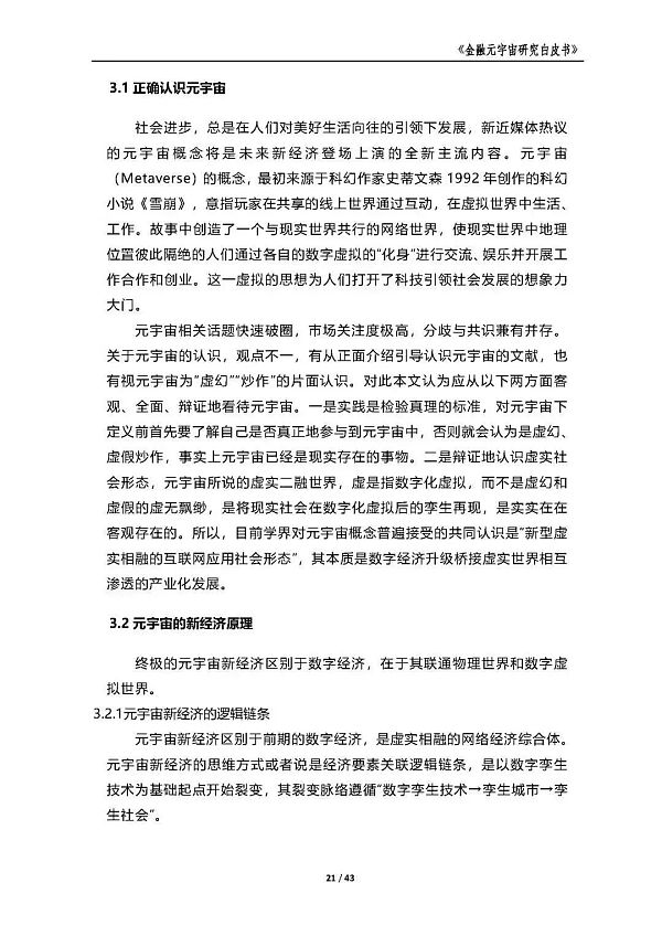 白皮書認為,元宇宙新經濟具有巨大的發展潛力,將引導一個國家或地區的金融發展創新方向。元宇宙的深度發展將可能重塑金融產業的模式和生態,而人依然是其中最重要的研究和服務主體。數字空間與物理空間的深度融合將加快金融行業數字化轉型,形成新的金融產業機遇。
