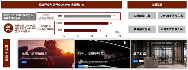 商業引擎拓展跨行業應用。產業數字轉型背景下影視、汽車、醫療及建筑等多行業展現出3D數字化需求,我們認為商用引擎將立足于游戲領域拓展跨行業應用,主要由于:商用引擎降低產業數字化門檻。商用引擎在通用性、易用性與適配性上趨于成熟,新手教程完善,工具插件豐富,將降低其他行業實現數字化的技術門檻。跨行業應用拓展引擎收入來源。目前商用引擎在游戲行業進入存量競爭階段,拓展游戲外行業應用為引擎帶來增量收入。根據Unity招股說明書,預計2025年游戲行業將實現營收約160億美元,同時2019年的數據顯示全球營收TOP100的游戲工作室中Unity客戶占比已達到93%;對比之下2019年Unity在跨行業應用的市場規模已達到170億美元,跨行業應用有望成為Unity長期增長動力來源。