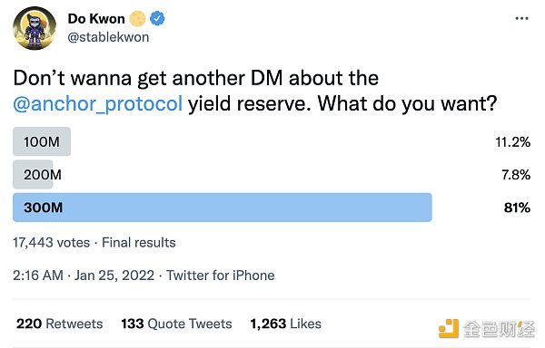 2022 年 2 月,面對鏈上儲備日益減少的情況,Do Kwon 被迫以 4.5 億美元的 UST 迅速對儲備進行注資。