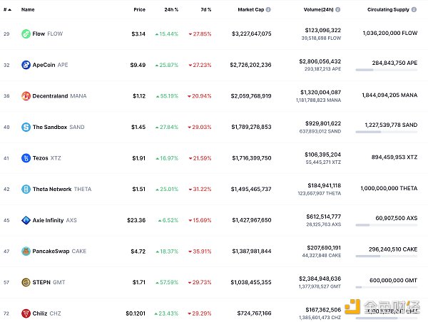 金色財經報道,據最新數據顯示,元宇宙相關加密資產總市值跌至144.4億美元,24小時交易額32.5億美元。當前市值排名前五的NFT通證分別是:ApeCoin(23.5億美元)、Decentraland(20.7億美元)、The Sandbox(16.4億美元)、Axie Infinity(13.0億美元)、THETA(12.9億美元)。