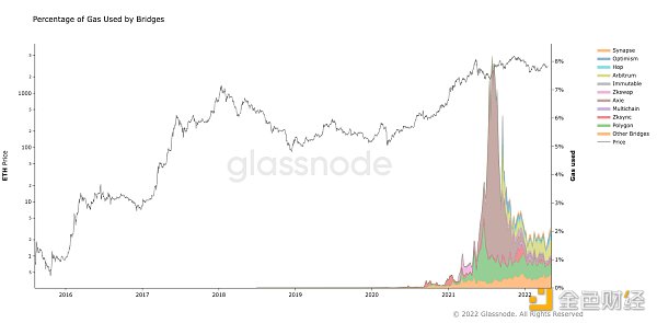 說到跨鏈,Bridge是最近出名的 gas 消費之一。 由于在以太坊上交易用以法幣計價變得相當昂貴,而競爭鏈在穩定性和功能方面逐漸成熟,我們看到了跨鏈資本流動的出現。除了在 Axie Infinity 受歡迎程度達到頂峰時,Ronin Bridge流行了一時(幾天內達到約 8% 的 gas 消耗峰值),Bridge的 gas 消耗在去年翻了一倍(從 1% 到 2%),包括在以太坊生態系統內將以太坊與 L2 擴容方案聯系的(Polygon、Arbitrum、Optimism)以及競爭公鏈生態系統(Avalanche、Polkadot)。我們越來與意識到,任何對資金流動有意義的見解都可能需要多鏈思維和工具。
