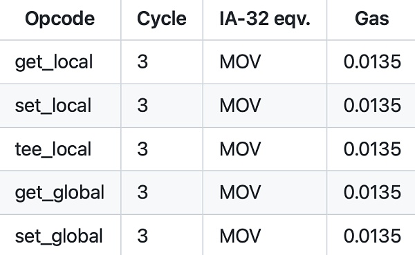 下圖中,我們截取了一些eWASM的opcode對應的Gas Cost: