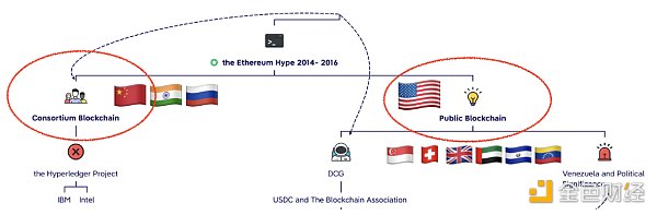 起初,美國和中國等國家都在努力鼓勵和探索聯盟鏈的使用案例,認為這是提高傳統行業效率的一種方式。然而,當中國還在堅持聯盟鏈的時候,Hyperledger項目已經逐漸瓦解,美國市場也明確轉向了前景廣闊的公有鏈。