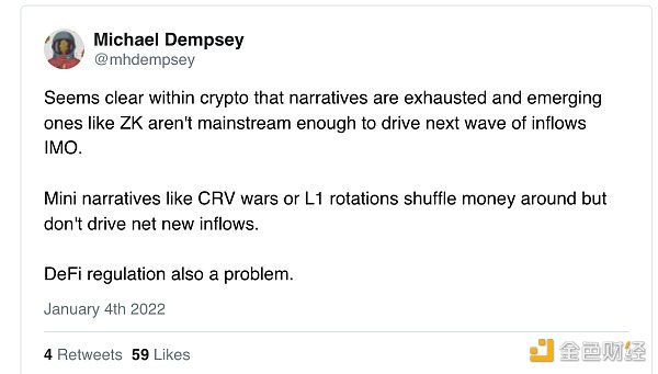 雖然理論上這個熊市是由宏觀條件的某種組合以及以加密貨幣為中心的崩盤開始的,但這并不意味著一旦世界重新在加密貨幣 上開啟“冒險”,加密貨幣將上行,就像它有下行一樣。雖然我確實認為有很多人開始交易股票并認為他們知道他們在過去兩年中所做的事情,但這些人會意識到他們沒有 alpha 并且可能會轉向加密作為在效率較低的市場中交易的一種方式,加密熊市通常是關于不活躍和缺乏敘事。