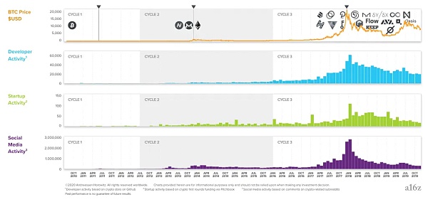 第三個周期在2017年達到頂峰,此時加密貨幣更廣泛的影響引起了主流關注。這一周期再次使該領域的開發者和初創公司數量增加了約10倍,加密貨幣從邊緣發展成為真正的創業領域。