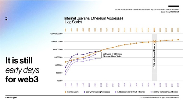 a16z估計,根據各種鏈上指標,估計有700萬到5000萬活躍的以太坊。就被接受的程度而言,我們就像1995年的互聯網一樣。