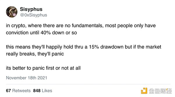 @0xsisyphus 的這條推文完美的反映了這一點。你對自己的態度越真誠越好。不要持有讓你感到不舒服或者恐懼的資產。如果有必要的話,請繼續留在這里。如果你最終選擇投降,我認為你應該盡快這樣做,賣掉你覺得不再持有的東西并不是一件可恥的事兒。