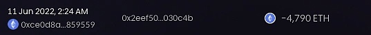 這兩筆交易中的第一筆是在 6 月 13 日 4:11 向 H 錢包轉賬 12967 ETH。在 17:35 左右,另一筆金額為 33856 ETH 的交易隨后被轉移到同一個錢包 H。