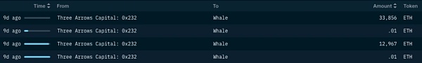 在 6 月 1 日到 6 月 11 日,我們看到共有 18050 ETH 從 3AC 轉移到 Deribit,其中大部分是在 6 月 7 日后交付的。這些 ETH 存款進入衍生品可能被用作額外的質押品,以保護 3AC 當前的頭寸或采取新的頭寸,從而對沖 3AC 當前的投資組合。