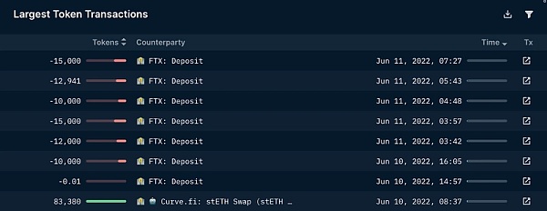 6 月 10 日 4:05 至 6 月 11 日 7:27,Amber Group 通過 6 筆單獨的交易共向 FTX 存款地址發送了 77941 stETH。考慮到 FTX 的 stETH/USD 市場的流動性非常薄弱,Amber 不太可能在公開市場上出售他們的 stETH。當時的訂單非常少,只要賣出 1.6 萬美元,價格就會下跌 2%,而在他們持有 stETH 頭寸時的市場價值約為 1.25 億美元。Amber Group 有可能與 FTX 達成了場外交易,或者他們只是試圖通過像 FTX 一樣的 CEX 掩蓋其 stETH 頭寸。