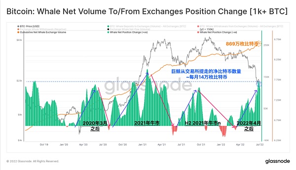 總的來說,鯨魚已經從我們追蹤的交易所提取了869萬枚比特幣,他們的積累和賣出周期似乎與市場價格有著很好的相關性。自2022年4月以來,鯨魚交易所的交易量一直以提幣為主,在6月達到了14萬枚比特幣/月的比率。這是過去5年中的第二高比率,僅次于2021年1月的修正。