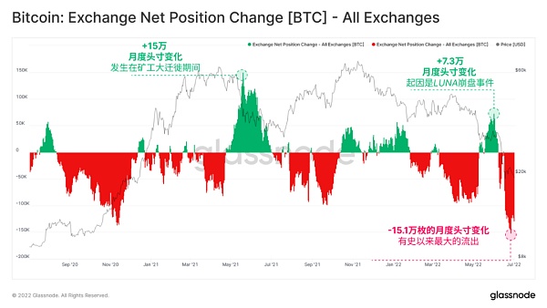 伴隨著歷史上糟糕的比特幣價格表現,交易所余額出現了有史以來最大的月度下降,達到了15萬枚比特幣/月的流出率。整個6月份的流出量占了交易所余額減少總量的5.0%至6.0%。這與2021年5月至6月發生的比特幣涌入交易所的情況形成了鮮明的對比。