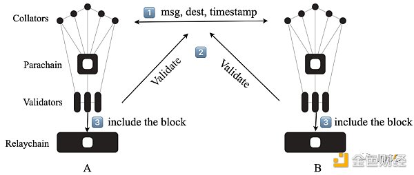 平行鏈間可以打開雙向通道,分別用于接收和發送消息。平行鏈 A 和平行鏈 B 之間進行 XCMP 通信,首先需要各自鏈上的 Collators 將消息、目的地和時間戳加入到自己的輸出隊列,而對方監測到消息后,將其加入到自己的輸入隊列,處理這條消息,并把區塊提交給 Validators。Validators 對消息進行驗證,隨后將該區塊包含在中繼鏈上。這樣視作完成一次跨鏈消息傳遞。