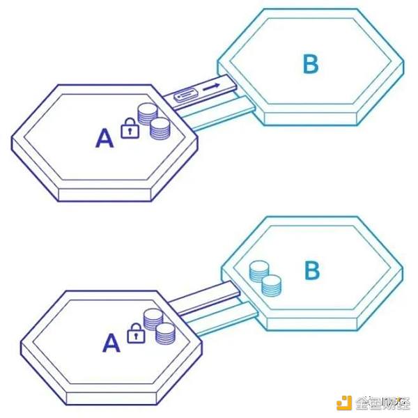 IBC 采用「鎖定 - 鑄造」的資產跨鏈模型。如上圖,Zone A 想要將資產跨鏈轉移到 Zone B,需要鎖定代幣并將證明發送給 Zone B,經驗證后,Zone B 在本身鏈上鑄造等量的代幣。該過程中資產并非產生了實際轉移,而是在 Zone A 鎖定這筆資產,在 Zone B 重新鑄造了等額的同一資產。