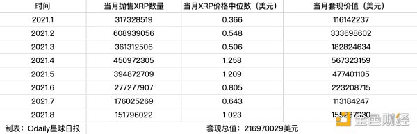 其次是第二階段,這也是 Jed 拋售力度最大的一段時間,我們以月為單位統計出了 Jed 的具體拋售數量,再結合當月 XRP 的價格中位數來估算其整體套現價值,得出的結果為該階段 Jed 合計套現約 21.697 億美元,具體計算過程如下: