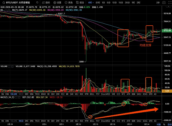 4小時級別,走的也是止跌反彈。兩次持續量能疊加下,站上了MA60均線并以此均線為支撐,開展震蕩走勢。MACD線金叉,由遠離0軸下方運行到了0軸之上,并獲得了一次0軸支撐,短線的支撐區間在5700-6000美金區間,不破支撐整體走勢良好。