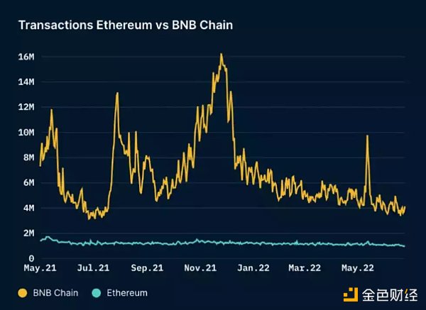 由于 BSC 相對較低的開發成本,在 BSC 上有大量生態項目開發活躍,21 年 11 月一度達到 1600 萬的日交易哈希數。