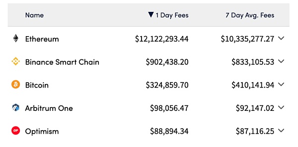 L1 和 L2 的費用排行,數據來源于 cryptofees.info
