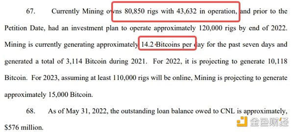 據破產申請披露,Celsius運營著美國最大的礦業公司之一。為了促進公司未來收益的增長,博取更大的收益率,Celsius早在2020年底就涉足了礦業。其具體表現是為挖礦業務提供了高達7.5億美金的循環貸款,而Celsius將其定義為一種對挖礦的長期投資。目前其共有8萬臺礦機,其中4萬余臺在運轉,每天能產出14.2個比特幣。Celsius希望用這種方式逐漸收回貸款的成本。