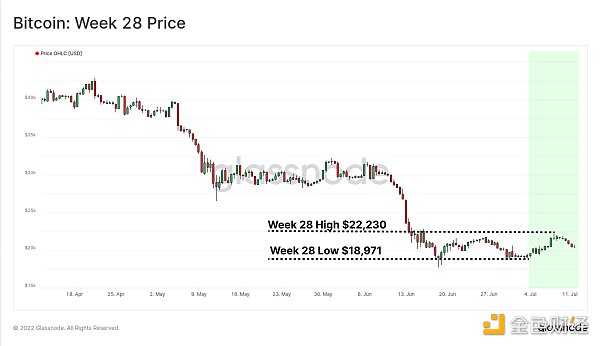 XRP/HKD+0.55%隨著市場消化了6月份的極端下行波動,比特幣價格本周繼續在2萬美元左右的范圍內盤整。交易價格走高,以18,971美元的周低點開盤,并在22,230美元處達到峰值。