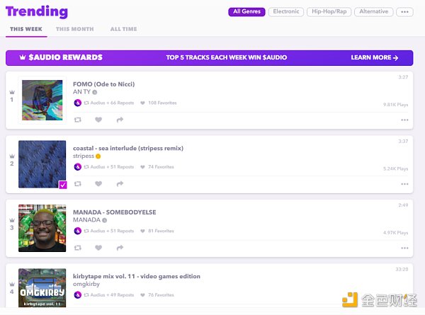 如前文提到在傳統流媒體模式下,流媒體作為第三方平臺處在藝術家和粉絲之間,藝術家報酬相對微薄,Web 3 音樂流媒體則有強烈的去中心化色彩,通過代幣激勵藝術家進行內容創作,實現營收,最有代表性的項目是 Audius。