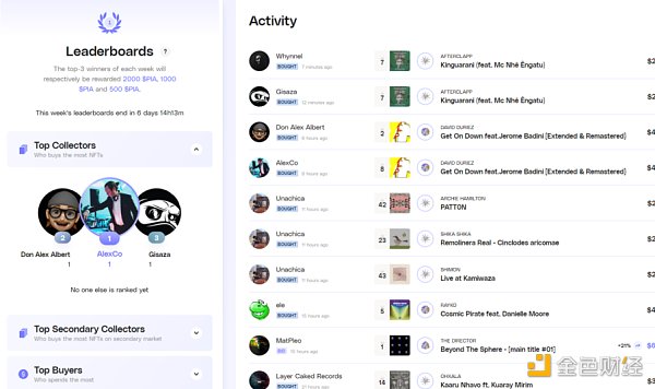 Pianity 是基于 Arweave 的音樂 NFT 交易平臺,一二級市場都有開放,買賣方法有即時買賣和拍賣。Pianity 的亮點在于代幣激勵,為了鼓勵交易,Pianity 也采用交易挖礦,但不是簡單的刷量,而是采用流動性補貼,一周內購買最多 NFT、二級市場購買最多 NFT、花費最多、最頻繁 Bid、邀請了最多新用戶的前三名,都可以獲得 PIA token 的獎勵,獎勵分為 2000PIA, 1000PIA 和 500PIA 三檔。此外其余在平臺上購買了 NFT 的用戶也會獲得獎勵,獎勵的 PIA 數量為用戶 Pianity 上 NFT 的總價值占平臺全部 NFT 總價值的份額乘以每周發放的 PIA 數量,由此激勵玩家購買和收藏。目前 PIA 還不能交易,定價在 0.1U。除了購買返現,PIA 的另一個作用就是持幣人投票決定歌曲的上架,社區決定 waitlist 中的哪一首歌曲可以上架,每天第一名的歌曲可以被鑄造成 NFT,審核權下放到了社區,有效減少去中心化音樂平臺的侵權問題。