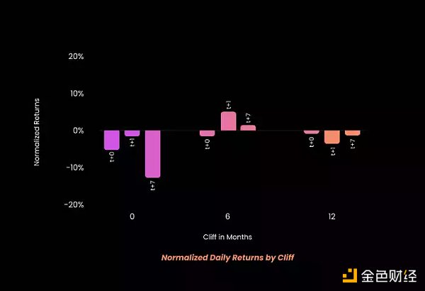 最后,我們研究了初始解鎖后每個解鎖日期解鎖數量、解鎖日之間的間隔和總鎖定期對 Token 價格的影響。為此,我們查看了初始解鎖后的每個解鎖事件,并記錄了解鎖事件當天、后天和后一周的最差每日標準化回報。