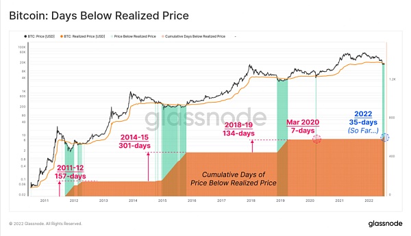 下圖顯示了之前的熊市周期是如何觸底的,并建立了低于已兌現價格的積累區間。低于實際價格的時間從2020年3月的7天到2015年的301天不等。